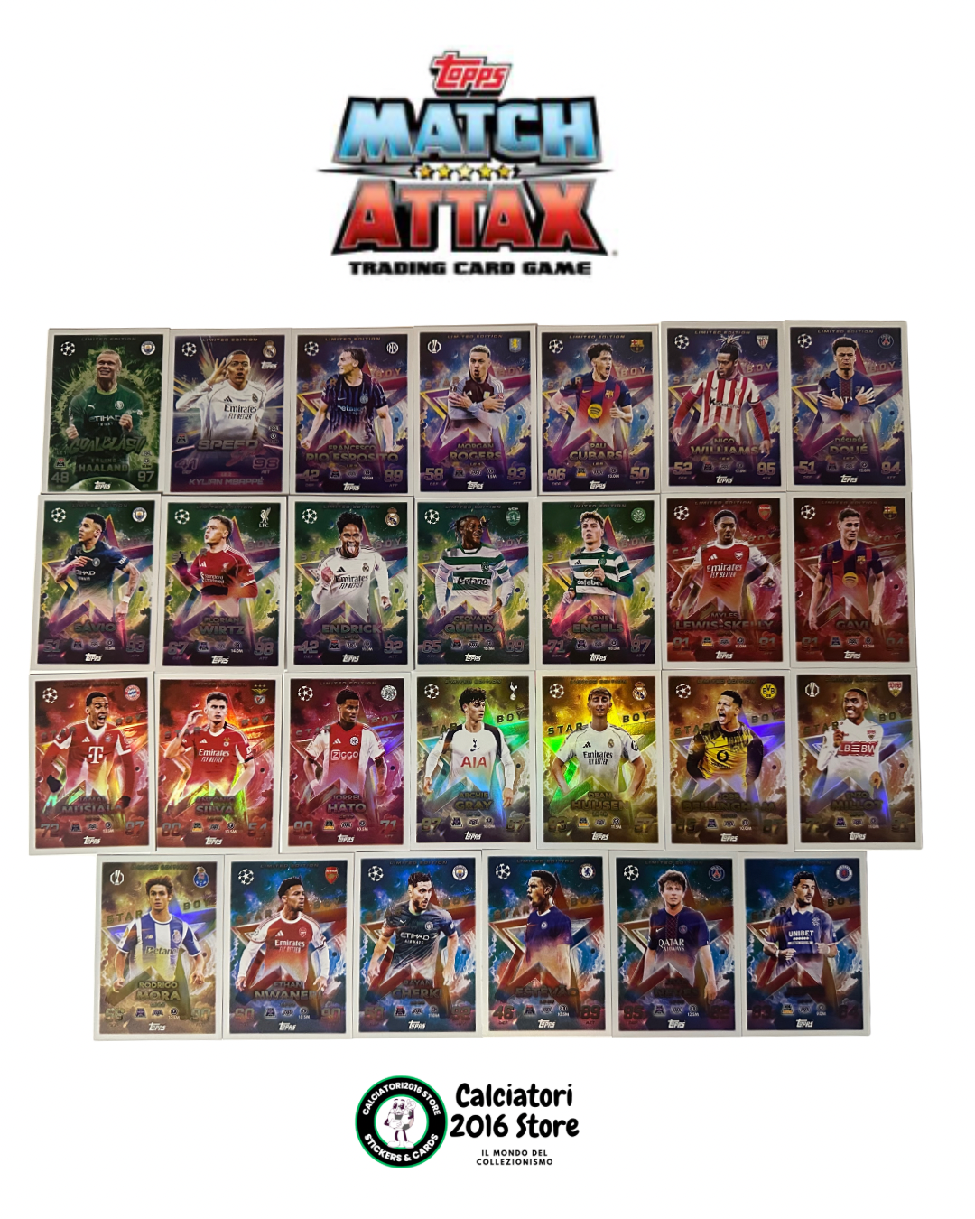 Offriamo un lotto di 27 carte Limited Edition della collezione Topps Match Attax 2025/26 UCL Champions League, perfetto per completare la tua collezione o aggiungere carte speciali.